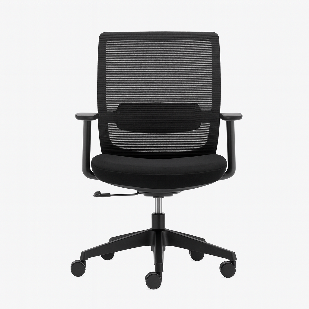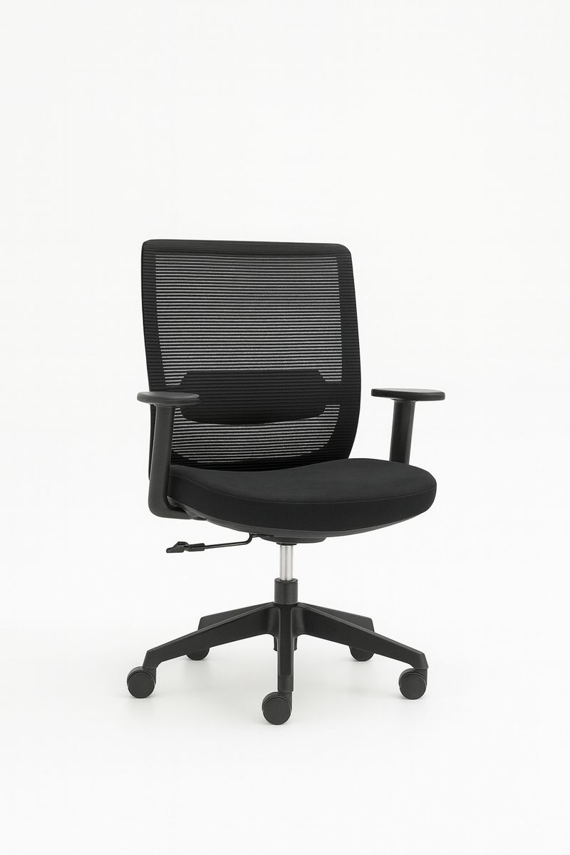 – Respaldo y Asiento: marco estructural de polipropileno con apoyo lumbar acolchado, ajustable en altura y recubierto con malla transpirable que favorece la ventilación y el confort prolongado