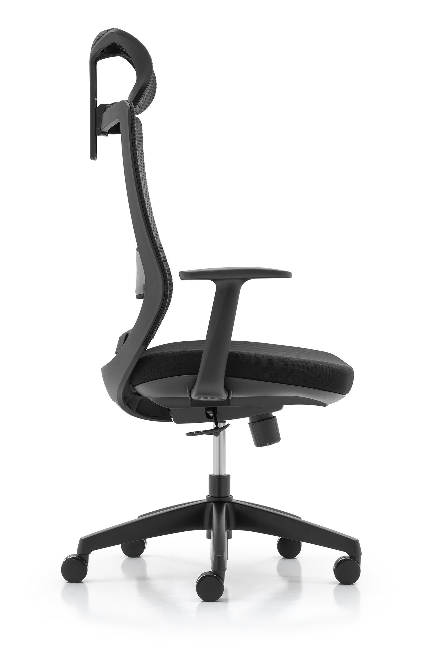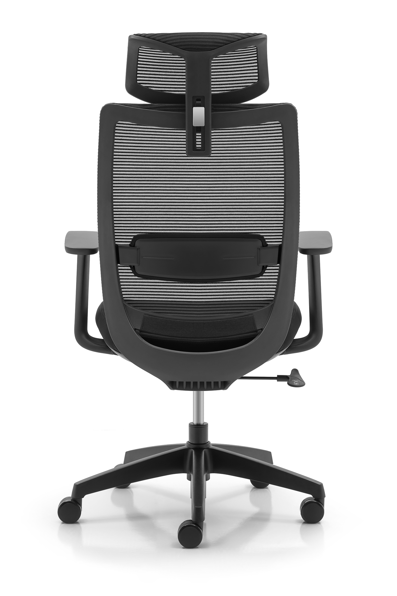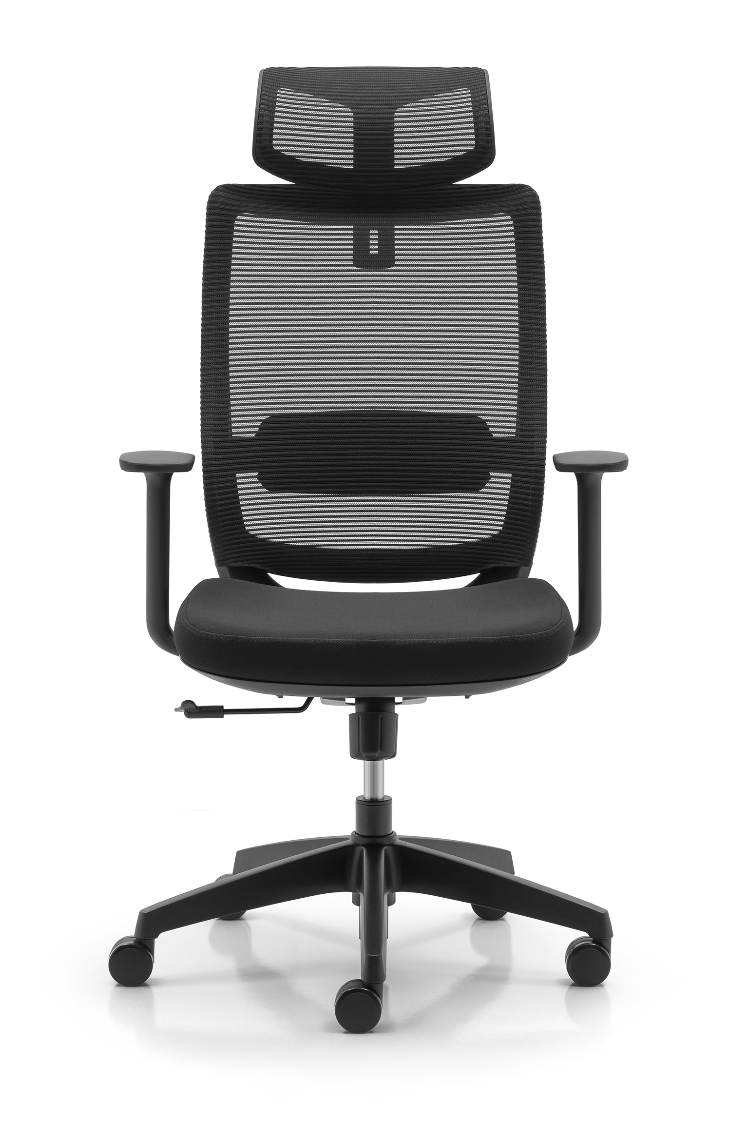– Respaldo y Asiento: marco estructural de polipropileno con apoyo lumbar acolchado, ajustable en altura y recubierto con malla transpirable que favorece la ventilación y el confort prolongado.